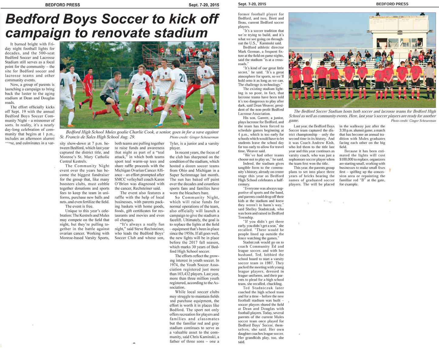 Click here to view Bedford Press Article September 7, 2015 "Bedford Boys Soccer To Kick Off Campaign To Renovate Stadium"
