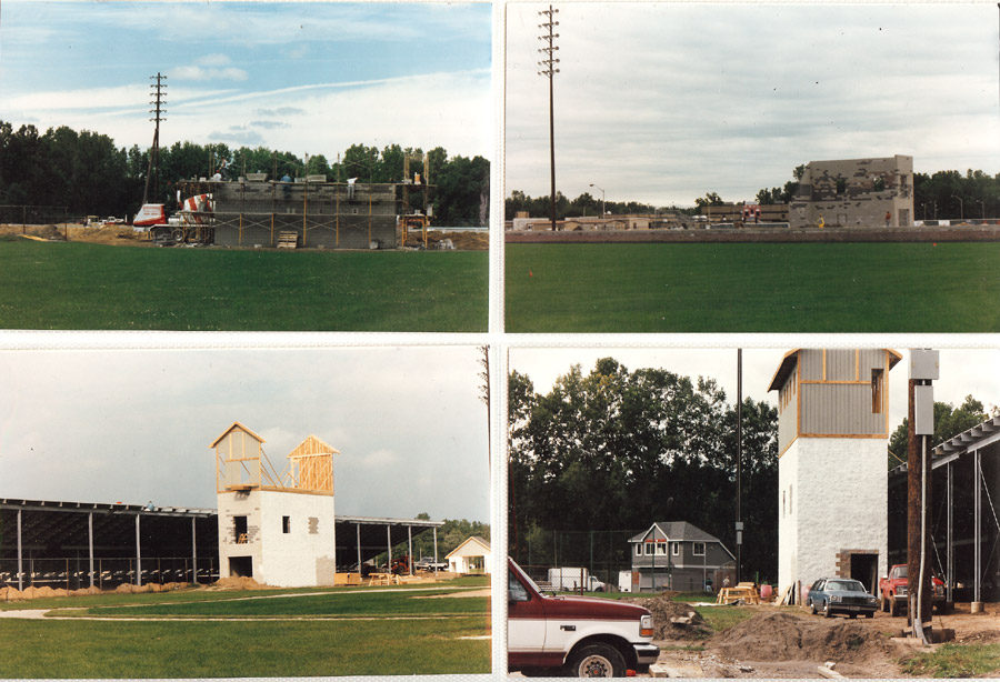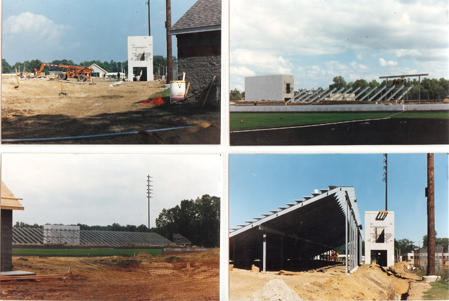 Fundraising for the project began in January of 1996. A conceptual model of the new community stadium was completed and was on display at the Bedford Trade Fair in March of 1996. The new stadium was constructed as part of the sports complex that housed a running track which is located behind the Bedford Junior High and High School buildings at Dean and Jackman Roads. Actual construction of the stadium began in the summer of 1996 with the renovation of the of the grass surface inside the track. An underground sprinkler system was also added at that time. Fundraising efforts continued into the spring of 1997. During this period of time the stadium committee had secured enough money from various fund-raisers, donor pledges and in-kind donations to secure a $1,000,000 loan to complete phase I of the stadium project (click here to read Bedford Board Resolution for Loan and payment schedule). Construction of phase I was completed in the fall of 1997. The first football game was played in the new stadium on October 3, 1997 in front an estimated crowd of 7,000 fans. Click here to read newspaper articles written about the stadium project from 1995 to 1998.