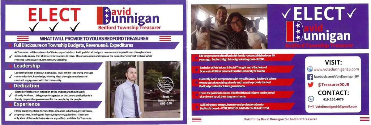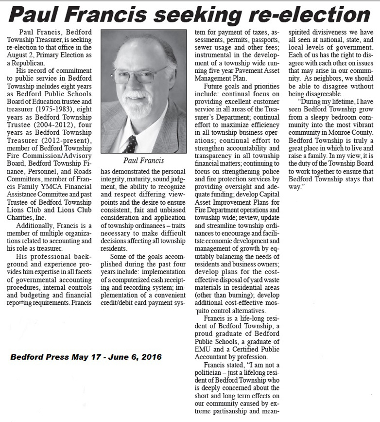 7. Where can Bedford Township residents obtain a copy of the candidates "Committee to Elect Campaign Finance Statements"? You can obtain a copy of the finance statements from the candidate themselves or request a copy from the Monroe County Clerk's office ( Laura Keehn, Election Clerk 734-240-7025) The cost is $1.00 per page. These statement include an itemized list of donors and expenditures as of September 2, 2016. A candidate can apply for a waiver if they did not receive donations or incur expenditures over $1,000. (view Michigan Campaign Committee Manual for more info.) We have sent a request by e-mail to all candidates who ran for Bedford Township office in the August 2nd Primary Election for a copy of their Campaign Finance Statement. As we receive statements we will post them to the Bedford Township Candidate Web Pages and Campaign Finance Statements page. As of this date (October 15th) we have received and posted copies for all the candidates who filed a statement or who applied for a waiver of the Committee Finance Statement.