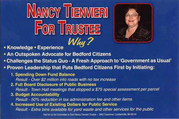 Bedford Now November 5, 2011: Letter to editor by Nancy Tienvieri "Money should go to improvements to roads, not maintenance"